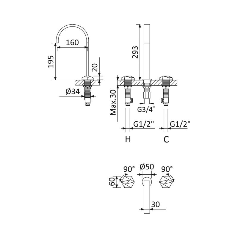 Bruma Utopia Mezclador de lavabo de 3 orificios Cromo Código de producto: 1832501CR