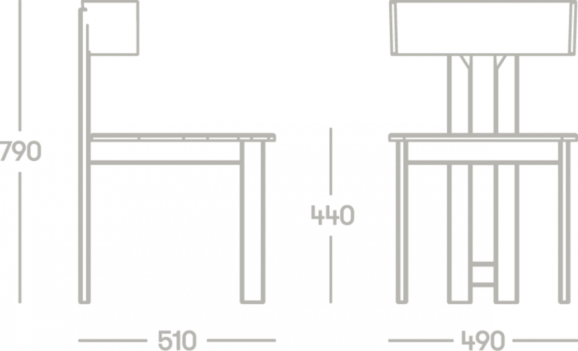El respaldo rectangular de la silla «TEO» se distingue por su diseño atípico, compuesto por dos listones de madera firmemente fijados. Las patas traseras dobles y el travesaño en el centro permiten mover el producto con facilidad.