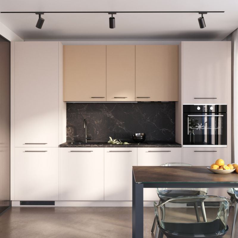 To create a special atmosphere in the kitchen, we took care of its "lightness". Simple linear configuration, convenient arrangement of modules, capacious pencil cases and concise handles. Exactly what is needed. Gray-beige facades add weightlessness to the design. This is our recipe for harmony.